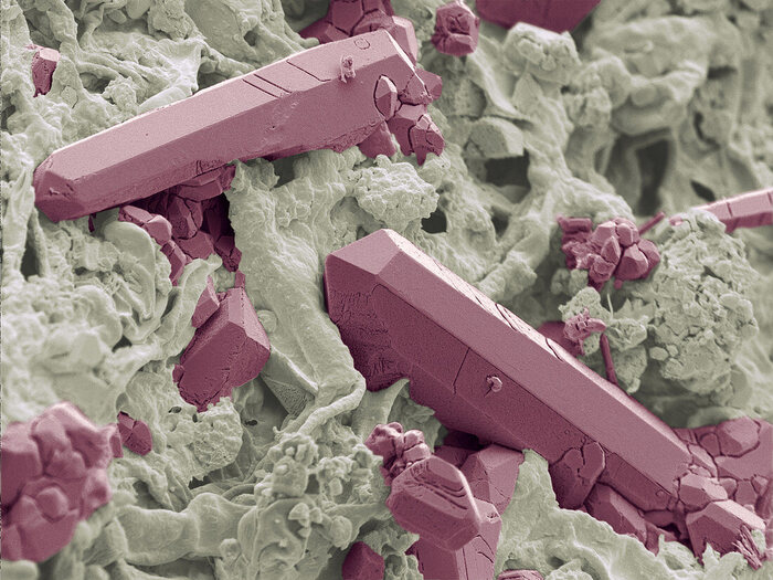 6. Микрофотография полиэдрических кристаллов графита (GPC, фиолетовый), растущих в порах стеклоуглерода. Также видны палочковидные кристаллы и нанотрубки (зеленые). Эти кристаллы представляют собой необычную форму углерода, обнаруженную в порах промышленного стеклоуглерода, выращенного в гидротермальных условиях высокой температуры и давления. Чрезвычайно тонкие игольчатые углеродные нанотрубки превращаются в высокоупорядоченные кристаллы. Более крупные GPC могут найти применение в нанотехнологиях благодаря их высокой электропроводности, прочности и химической стабильности. Увеличение: x5800 при размере 6x7 см.