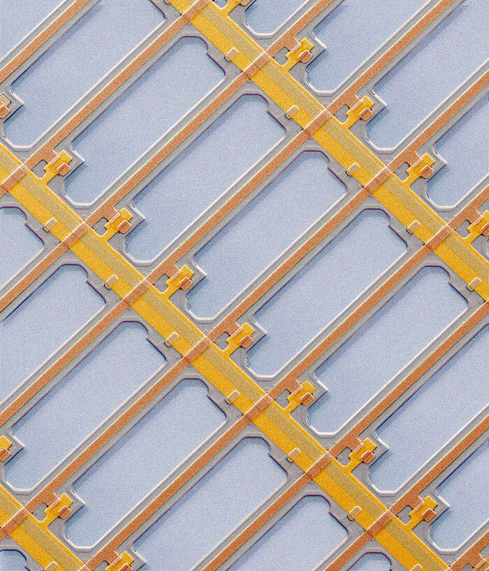10. Микрофотография детектора, который можно использовать для измерения теплопроводности газов. Он содержит золотую проволоку (слева вверху справа внизу), которая в 200 раз тоньше человеческого волоса. Когда между газами происходит реакция, изменение состава приводит к изменению температуры и, следовательно, сопротивления проволоки. Это вызывает сигнал о том, что реакция произошла. Такие детекторы будут встроены в микрореакторы для производства небольших количеств химикатов. Этот детектор был разработан немецкой технологической компанией Siemens. Увеличение: x670 при печати шириной 10 сантиметров.