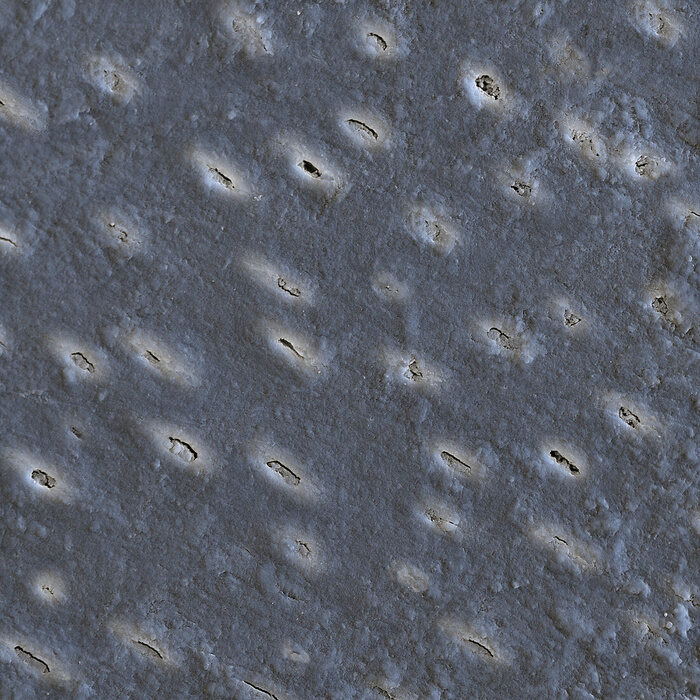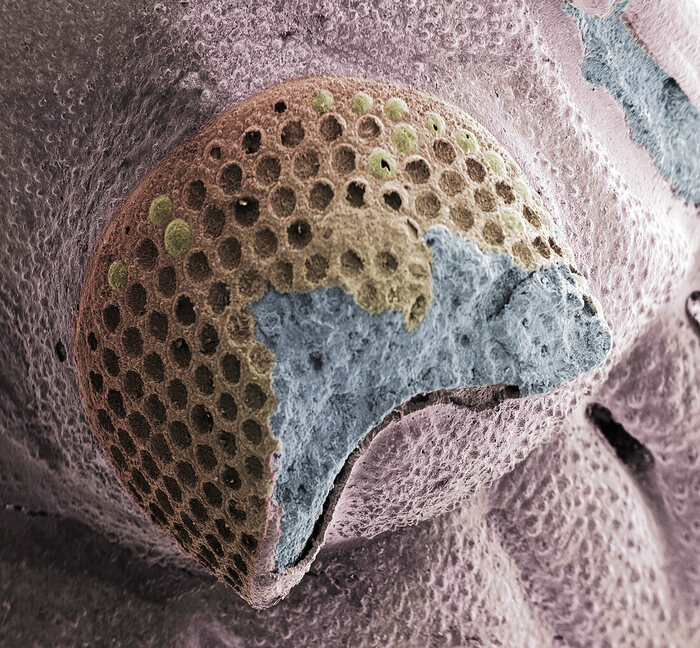 5. Микрофотография окаменелости глаза трилобита. Трилобиты были членистоногими, сегментированными беспозвоночными с панцирем, включая крабов, насекомых и пауков. Как и у насекомых, их глаза были сложными, состоящими из набора крошечных линз (отверстия видны здесь). Уникально то, что глазные линзы трилобита были сделаны из кальцита, прозрачной кристаллической формы карбоната кальция. Трилобиты были морскими животными, питавшимися на морском дне. Их длина варьировалась от 0,1 до 70 сантиметров. Они жили между 500 и 300 миллионами лет назад. Формирование окаменелостей происходит, когда объект погребен под породообразующим материалом, таким как ил, который сохраняет структурные детали. Увеличение: нет данных.
