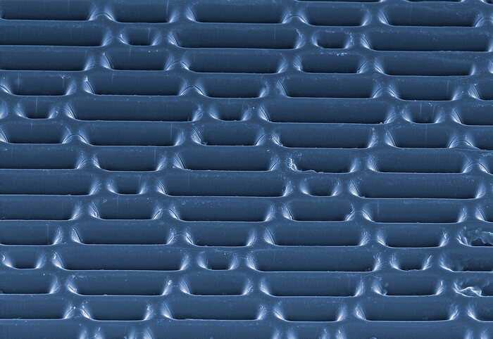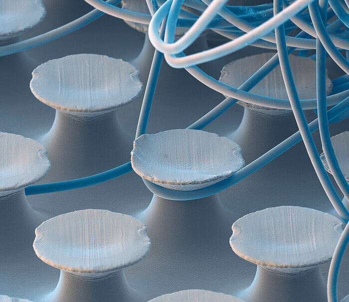 1. Микрофотография микроструктурированной силиконовой пленки с примерно 29 000 клейких элементов на квадратный сантиметр, вдохновленная лапами геккона. Он прилипает к гладким поверхностям с помощью слабых межмолекулярных сил, известных как силы Ван-дер-Ваальса. Увеличение: х70 при печати шириной 15 сантиметров.