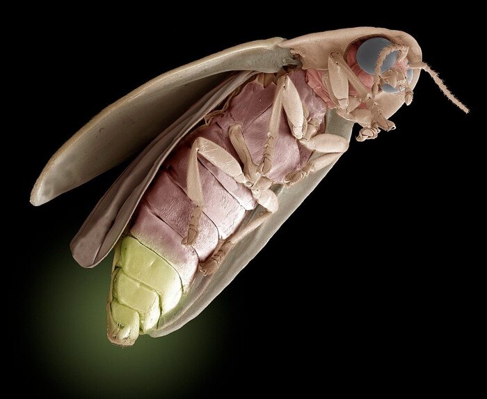 4. Микрофотография светлячка (семейство Lampyridae). Эти крылатые жуки, также известные как жуки-светлячки, получили свое название благодаря своей способности испускать свет брюшком. Это достигается с помощью фермента (люциферазы) для окисления химического вещества в камере на кончике его брюшка (внизу слева) и известно как биолюминесценция. Светлячок контролирует вспышки, регулируя количество кислорода, поступающего в камеру. Вспышки света используются для привлечения партнеров. Увеличение: x6 при печати шириной 10 сантиметров.