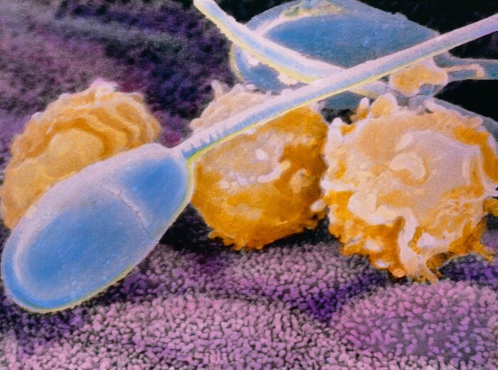 7. На этой раскрашенной микрофотографии мы видим два сперматозоида на поверхности матки, которые разрушаются тремя лейкоцитами (желтый). После эякуляции сперматозоиды могут оставаться живыми в женских половых путях в течение примерно 24 часов. В начале своего пути во влагалище сперматозоиды насчитывают около 300 миллионов, но лишь несколько сотен выживают и достигают фаллопиевых труб, остальные также разрушаются. Эпителий этой области населен простыми столбчатыми секреторными клетками (фиолетового цвета), покрытыми крошечными выростами, известными как микроворсинки. Увеличение: х4050 при размере 6х7см. x5790 на 4x5 дюймов