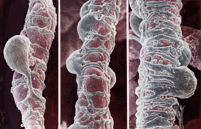 7. Мелкие кровеносные сосуды с перицитами. Перициты представляют собой гладкомышечные клетки, которые развиваются в соединительной ткани и стабилизируют стенку кровеносных капилляров. На первом изображении показан перицит капилляра с первичными отростками, направленными в продольном направлении, и вторичными отростками, идущими по окружности. На втором изображении показан артериальный капилляр с многочисленными ассоциированными перицитами, а на третьем — терминальная артериола с перицитами и круговыми гладкомышечными клетками. Увеличение: нет данных.