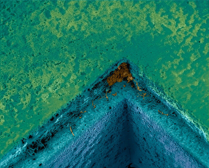 9. Микрофотография полостей (красный цвет), развивающихся в зубе. Полости вызваны зубным налетом, пленкой бактерий, встроенных в гликопротеиновый матрикс. Матрикс формируется из бактериальных выделений и слюны. Бактерии питаются сахаром в пище, производя кислоту как побочный продукт. Эта кислота разъедает эмаль зубов, что приводит к кариесу. Увеличение: нет данных.