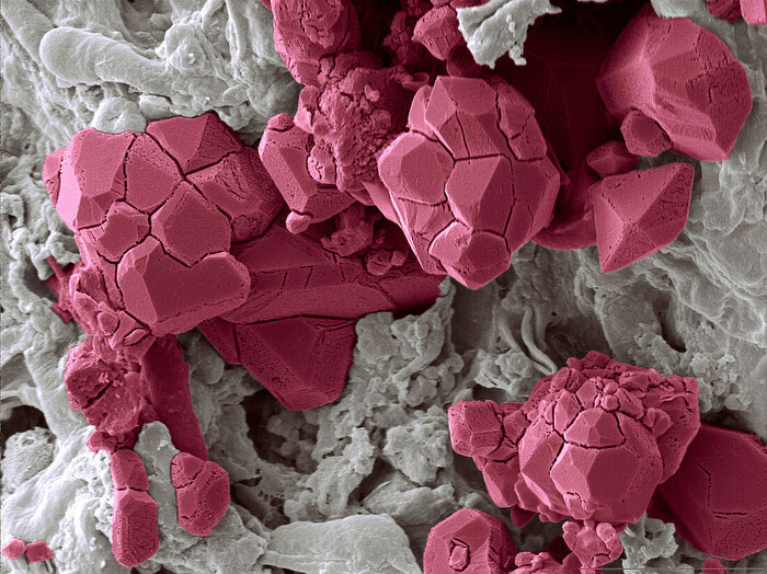 6. Красный дрожжевой рис получается в результате ферментации обычного риса грибком Monascus purpureus. Грибок частично переваривает гранулы рисового крахмала и производит встречающиеся в природе статины, то есть вещества, которые, как известно, ингибируют выработку холестерина в организме человека. Статины кристаллизуются на поверхности рисового зерна. Таким образом, с красным дрожжевым рисом китайцы принимают статины уже более тысячи лет. Грибок вырабатывает монаколин К, также известный как мевинолин, который является таким же активным статином, как и препарат ловостатин. Ширина изображения: 80 микрометров, увеличение: 1250x, если изображение печатается шириной 10 см.