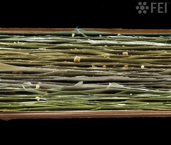 На изображении представлена обычная бумага DIN-A4. Бумага изготовлена из растительных волокон, которые измельчаются, отбеливаются, разбавляются водой, сушатся, а затем затвердевают. Обычно в целлюлозную массу добавляют такие вещества, как полипропилен или полиэтилен, чтобы обеспечить различные характеристики.