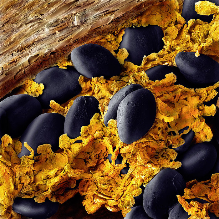 Нет, это не черные угольки в догорающем костре. На фото, сделанном с увеличением в 88 раз, запечатлены семена орхидеи Vanilla planifolia, а лежащая рядом «доска» — стенка ванильного стручка. Содержимое семян оценивается практически на вес золота: килограмм выделяемого из них ванилина в 2016 году стоил 11 тысяч долларов, а килограмм драгметалла — 40 тысяч.
