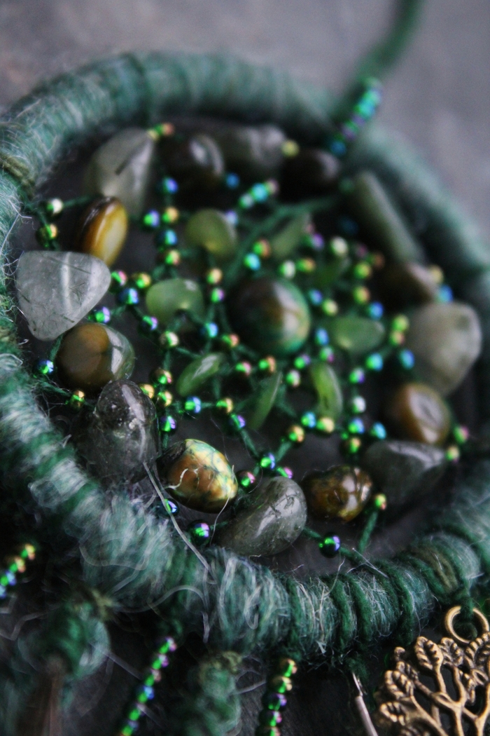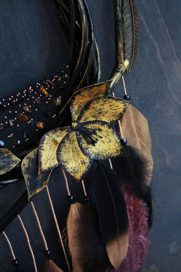 В этом Ловце я использовала такие минералы как гранат, чёрный агат, коралл и золотой обсидиан. Основа - ива, тонированная акрилом. Оперение - петух, гусь и страус.