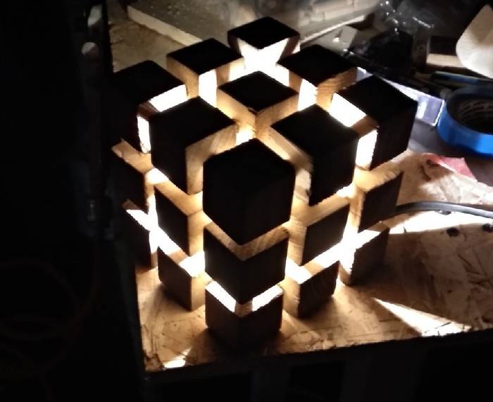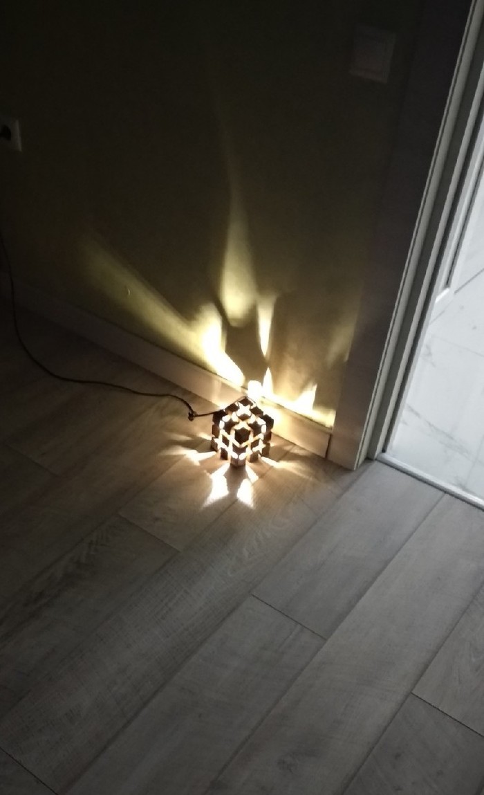 4 Сборка куба сажаем на шканты (можно с клеем но и без него неплохо держит) сажаем на термоклей цоколь и диодную лампу.