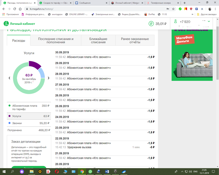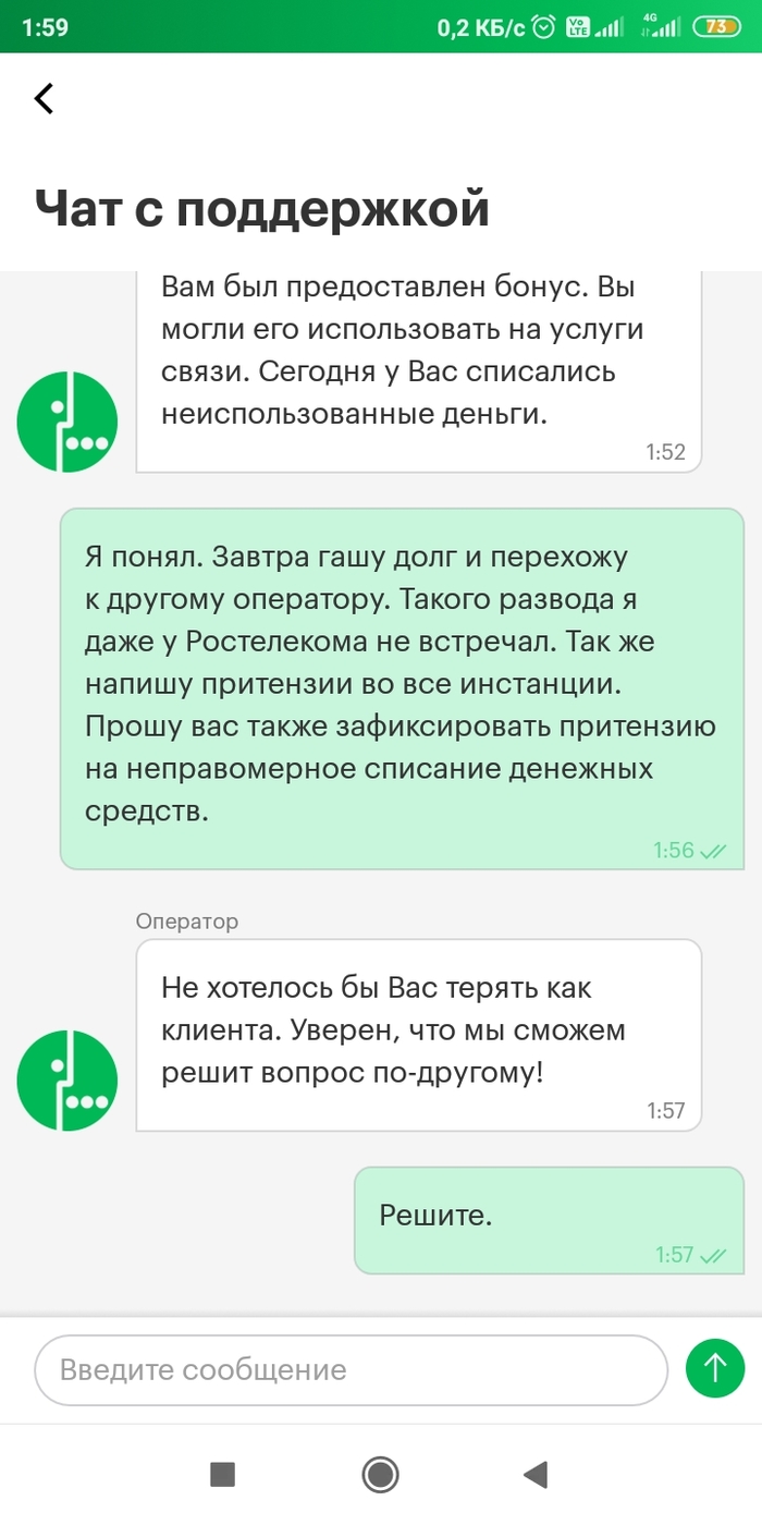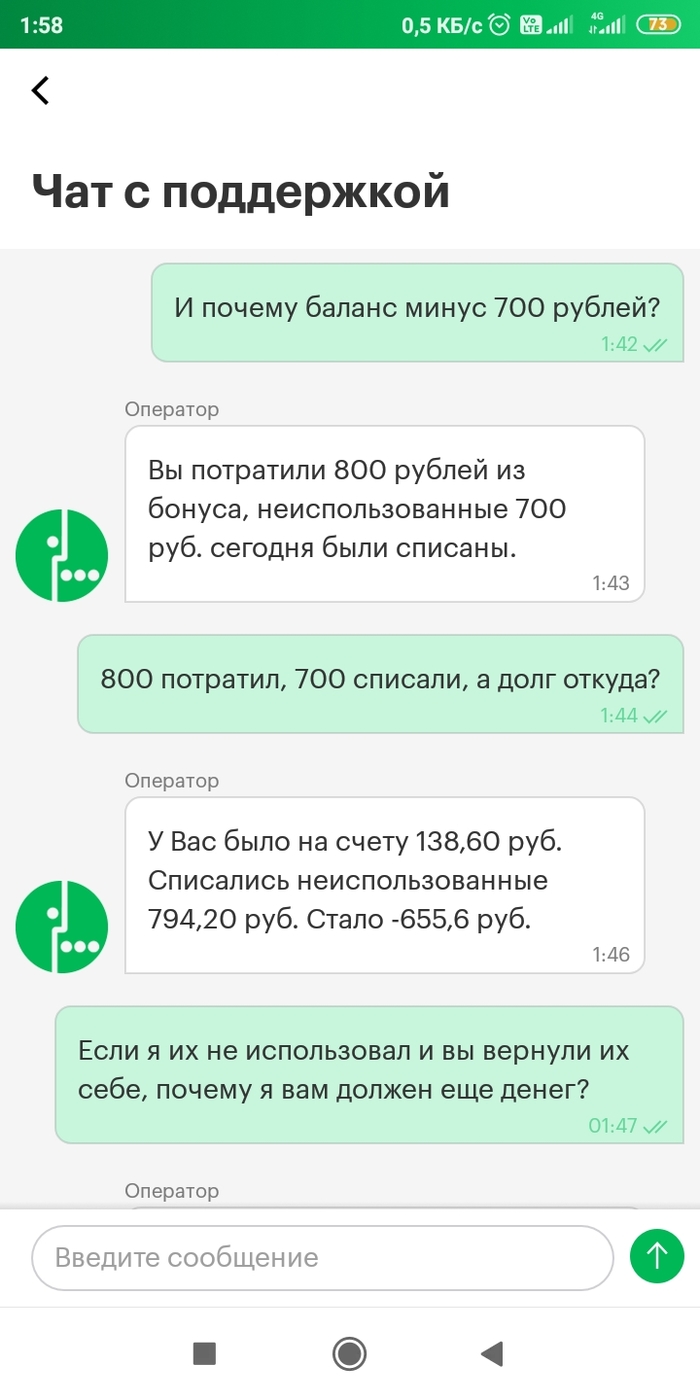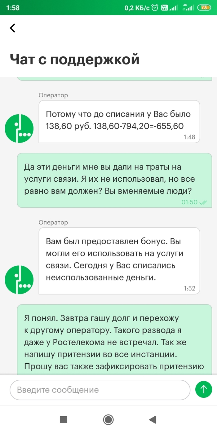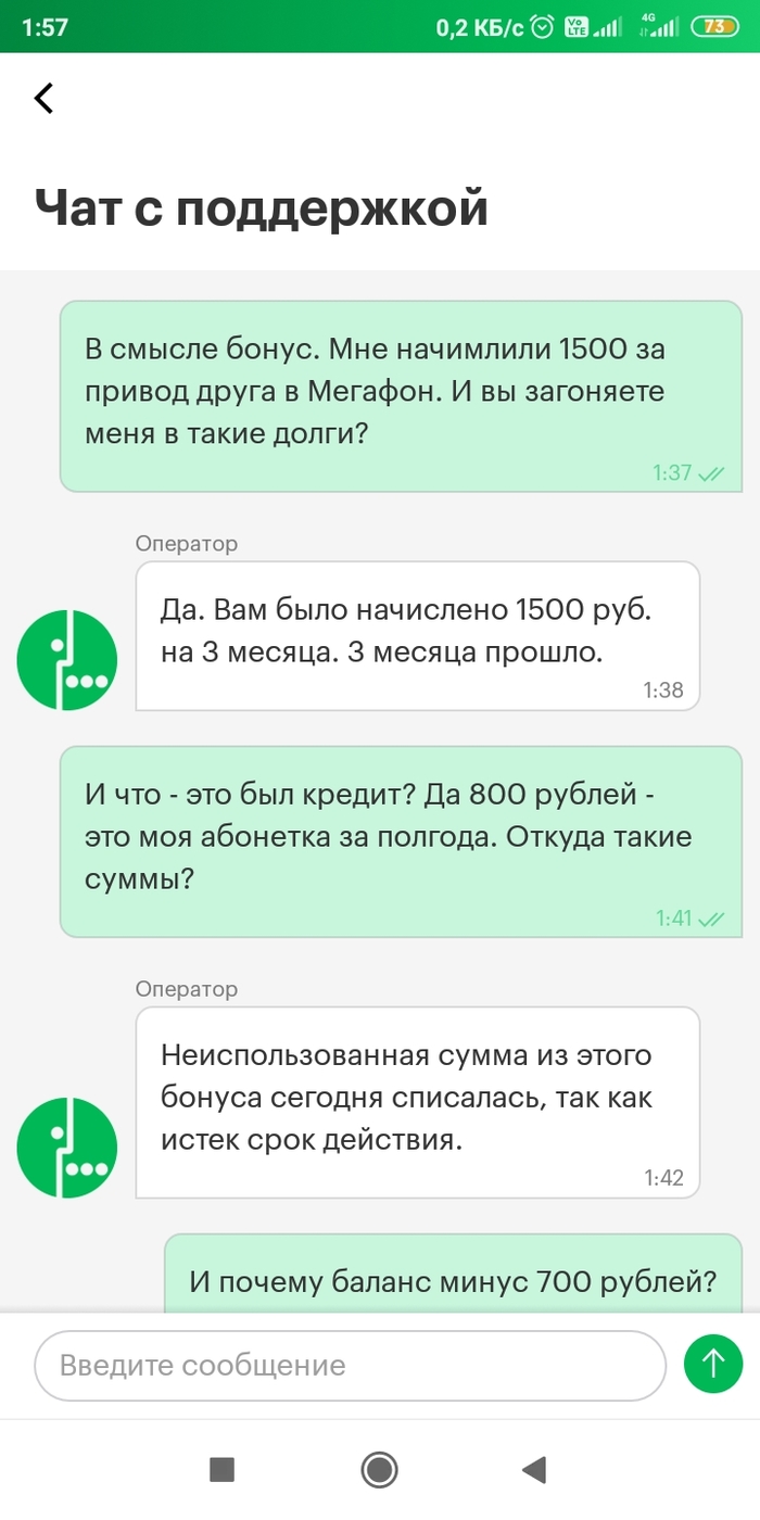 Сегодня пришла СМС о том, что номер заблокирован из-за недостатка средств. Зашёл в ЛК и офигел: минус почти 700 рублей. Написал в поддержку и ответы оператора меня сильно порадовали. Я участвовал в акции приведи друга, получил бонус 1500 рублей который можно тратить на связь. 800 рублей я потратил, 700 они списали, т.к. истек срок действия. Но почему-то я оказался Мегафона должен!) Абон. плата кстати у меня 125 рублей в месяц и 700 рублей мне хватило бы месяцев на 6!!!))) Подскажите куда лучше писать претензию. А так завтра гашу долг и иду в Билайн или Теле2. Мегафон исчерпал мое терпение. Кому интересно, скрины переписки с оператором.