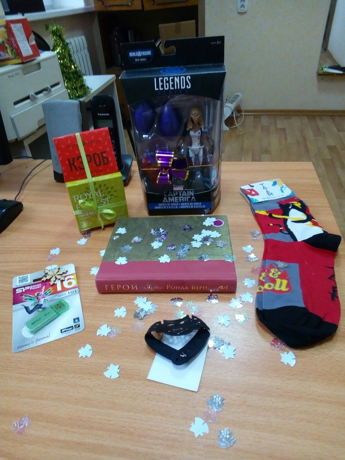 Флешка постоянно требуется на работе, а деревянную снежинку повешу на елку) Браслет с совушкой и совершенно-опупенские кото-носки! )))) Книга редкого для меня формата, всегда было интересно почитать что-то такое) И море замечательных блестящих колокольчиков)