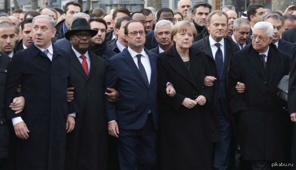Политики шли не в головной части колонны народа, а по закрытому переулку, ведущему к площади Леон Блюм. “Народ” за политиками - не парижане, а силы безопасности