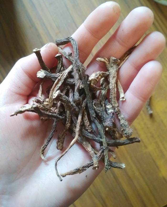 После сушки обжариваем корни на сухой сковороде, при этом они очень интересно пахнут какао и орехами.