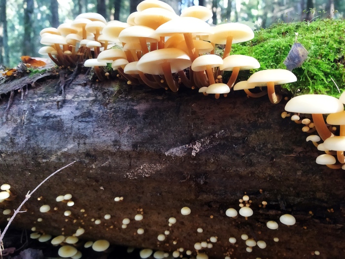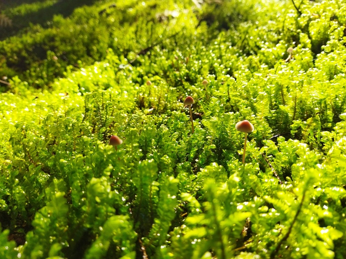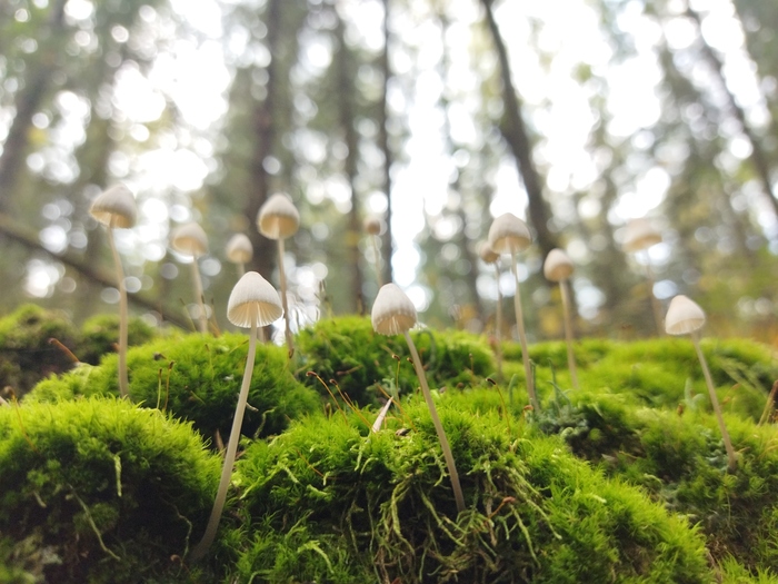 Конец октября. В еловом лесу всё усыпано маленькими нежными грибочками - миценами. Поражает многообразие их форм и окрасок
