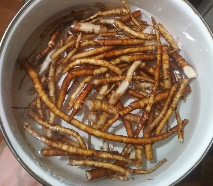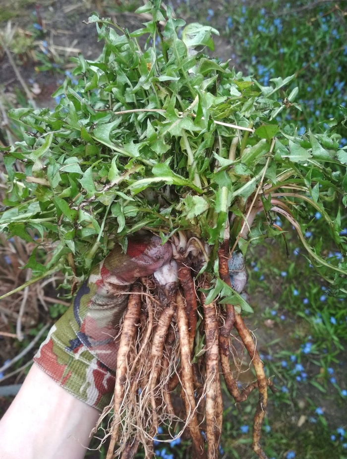 Выкапываем одуванчики, отрезаем зелёные вершки. Корешки несколько раз промываем, чтобы на них не осталось земли.