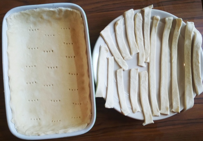 Потом берём 300 грамм слоёного дрожжевого теста, 2/3 выкладываем в смазанную сливочным маслом форму для выпечки, распределяем его по поверхности и бортикам и прокладываем вилкой. Остальное тесто я нарезала полосками для украшения.
