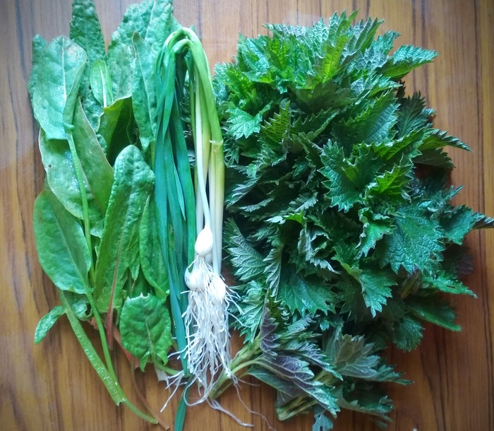 Возьмём пучок молодой крапивы, щавель и немного зелёного чеснока для аромата.