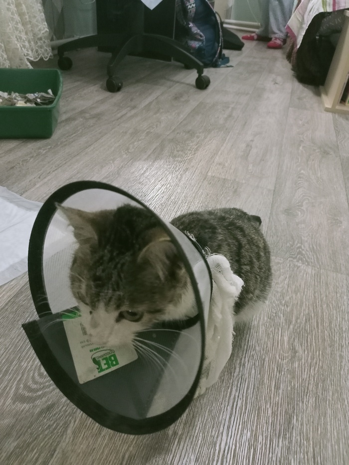 Отвезли, там остатки лапы ему удалили и сказали через часа три за ним приехать, он сильно обезвожен, нужны капельницы. Спросили сперва, а что дальше с ним делать собираемся. А что тут делать, оставим себе, третьим будет, два уже есть кота. И собака.