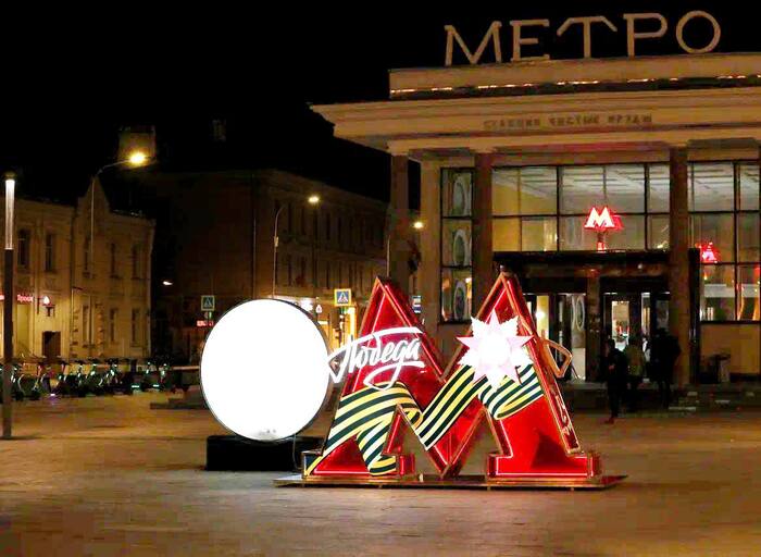 Рядом с 10 станциями метро разместили инсталляции в виде звезд — одного из главных символов Дня Победы, а на станции «Чистые пруды» установили объект в форме буквы «М» с георгиевской лентой и надписью «Победа».