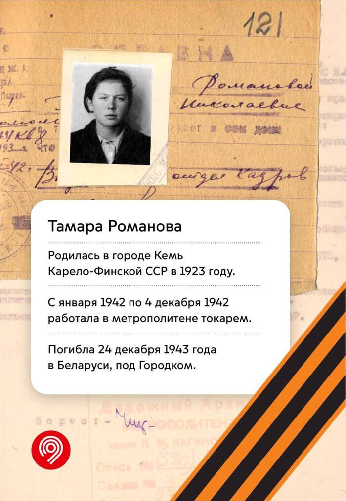Тамара Романова работала токарем в метро и пошла добровольцем на фронт с еще двумя женщинами-токарями в декабре 1942 года. Вероятно, коллеги-подруги решили идти вместе. Тамара служила в артиллерии, была радистом. Погибла в декабре 1943 года на территории Беларуси.