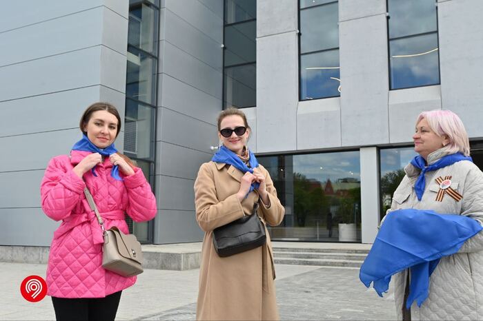 Зрителям подарили синие платочки — символы мирного неба и женской верности.