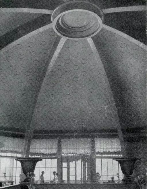Основной двухэтажный корпус удивлял непривычной восьмиугольной крышей и расположенной под ней круговой прогулочной галереей. Там же, на втором этаже, располагался ресторан, к нему вела парадная лестница. На первом – зал ожидания. В зависимости от назначения зоны здания использовали во внутренней отделке различные цвета. Для удобств пассажиров обустроили небольшую гостиницу, ресторан, прочие службы. Расположенный рядом павильон для пассажиров пригородного сообщения был соединен с основным зданием крытым переходом.