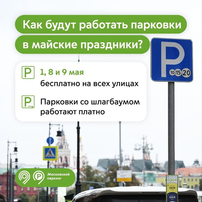 1, 8 и 9 мая парковка будет бесплатная на всех улицах Москвы.