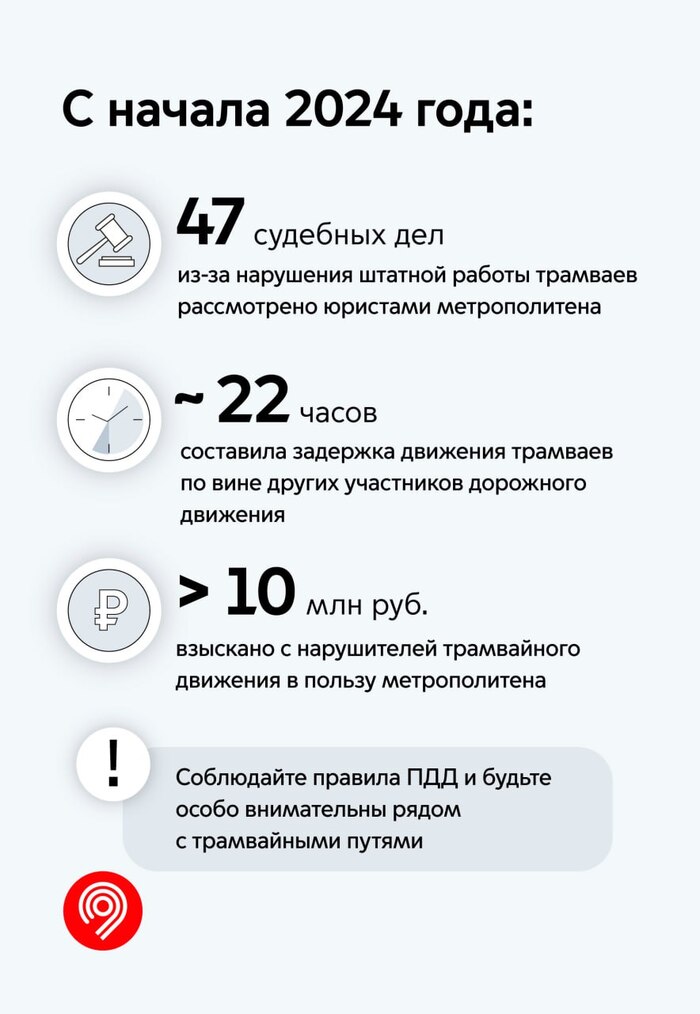 Как следствие — движение на трамвайной линии останавливается, рейсы задерживаются на несколько часов, пассажиры теряют время в пути. Так, общая задержка движения трамваев из-за ДТП по завершенным с начала года судебным делам составила почти 22 часа.