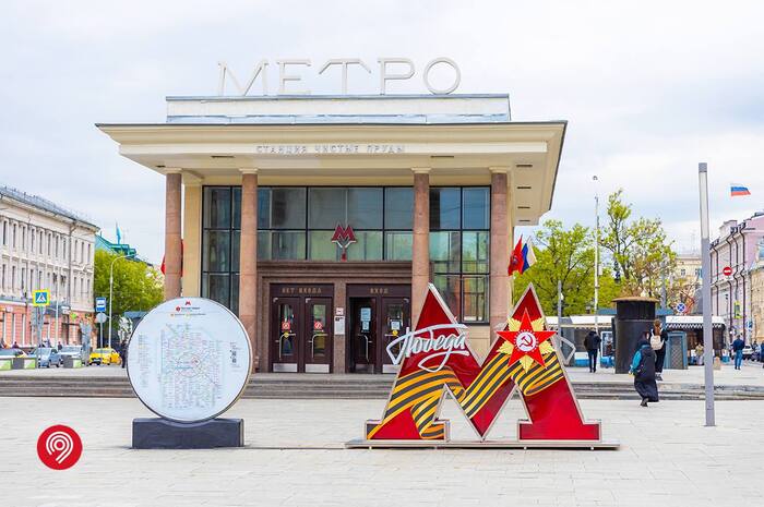 Букву «М» с георгиевской лентой можно увидеть возле станции 1️⃣ «Чистые пруды» (выход №2).