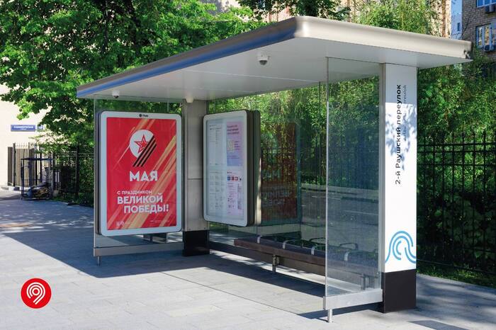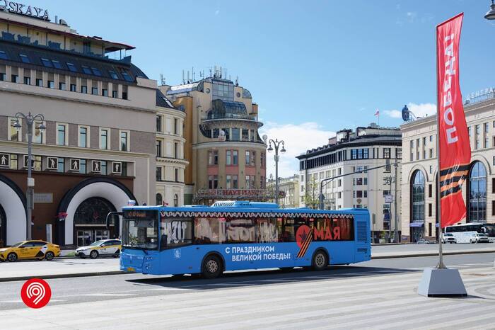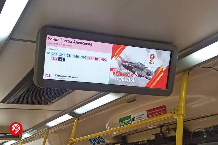 На медиаэкранах показывают ролики, подготовленные ко Дню Победы. Водители выходят на маршруты в парадной форме и с георгиевскими ленточками.