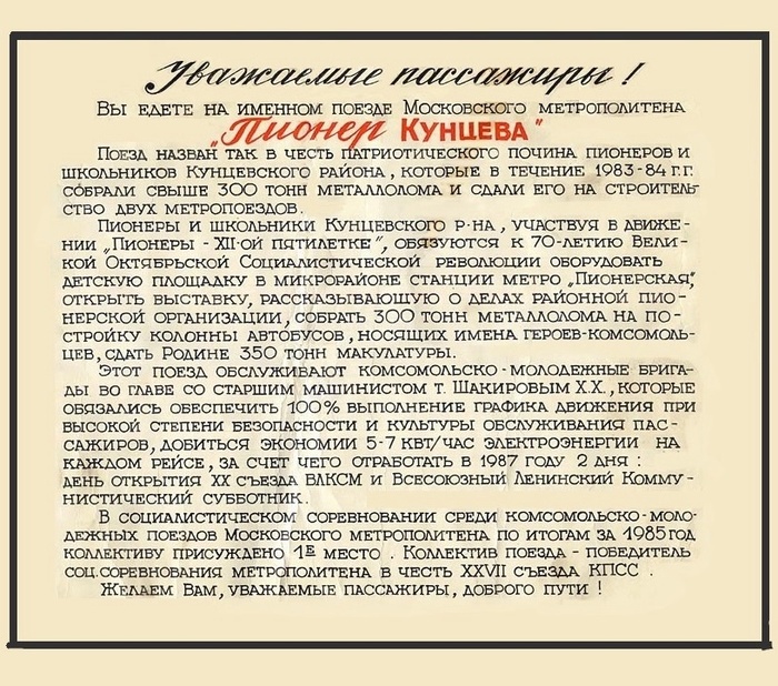В 1983 году с такой инициативой выступил комитет комсомола Кунцевского района Москвы. Они предложили пионерам собрать металлолом для создания двух новых поездов, которые в дальнейшем будут ходить по Филевской линии. Даже имена составам выбрали: «Пионер Кунцева» и «Молодогвардеец», так как на территории района располагались станции «Пионерская» и «Кунцевская», а также улица Молодогвардейская.