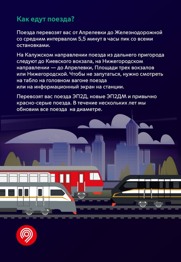 Новый диаметр протянулся с запада на восток московского региона и соединил Апрелевку, Внуково и микрорайон Железнодорожный города Балашихи. Появились десятки новых маршрутов, а поездки стали быстрее, удобнее и выгоднее. Дептранс Москвы вместе с коллегами из РЖД и ЦППК провели масштабную работу для запуска: построили новые московские городские вокзалы, обновили поезда, уложили пути.