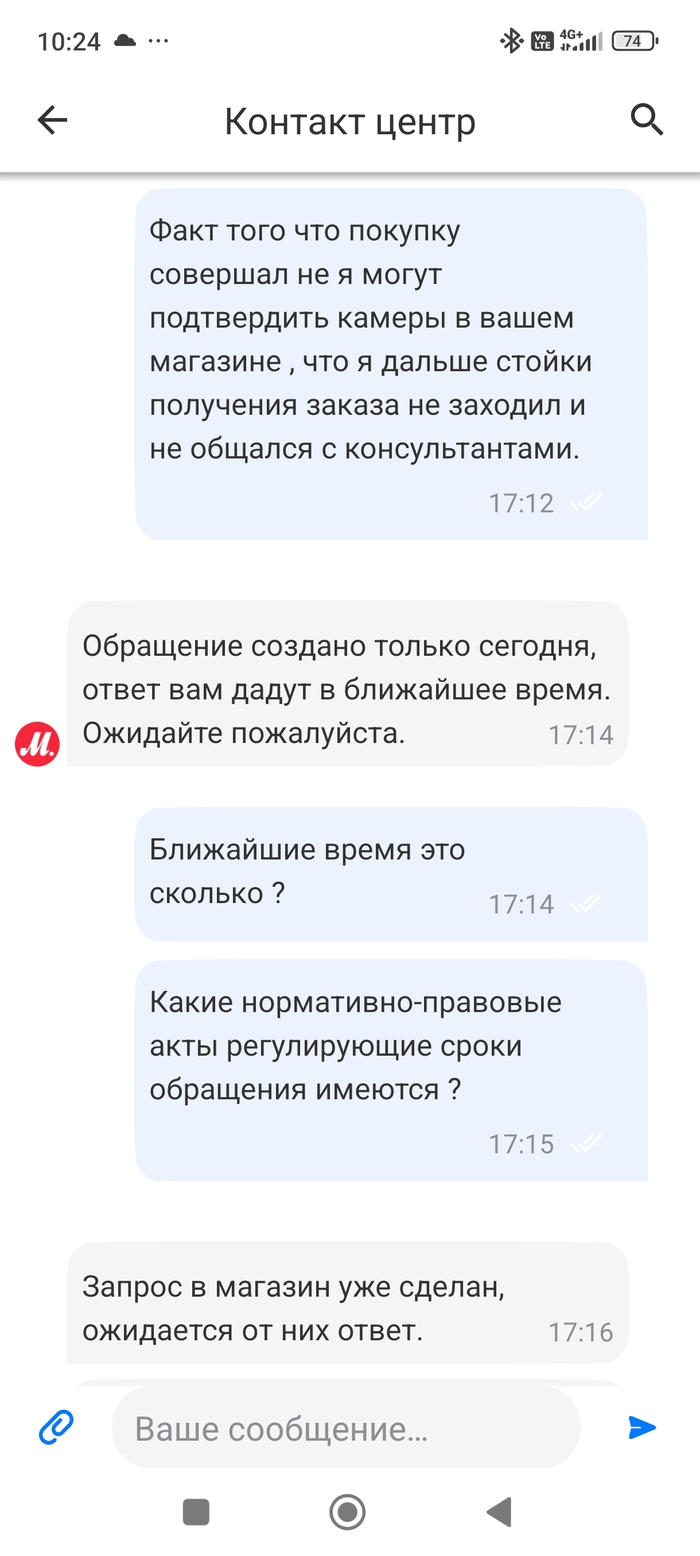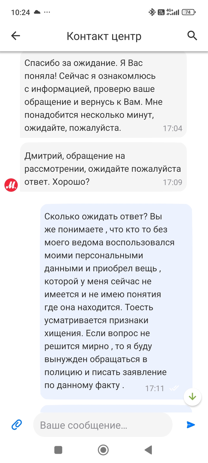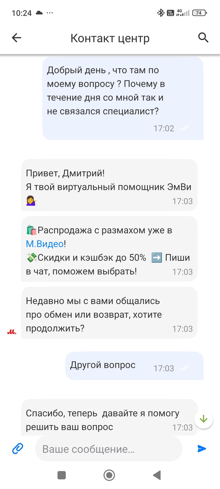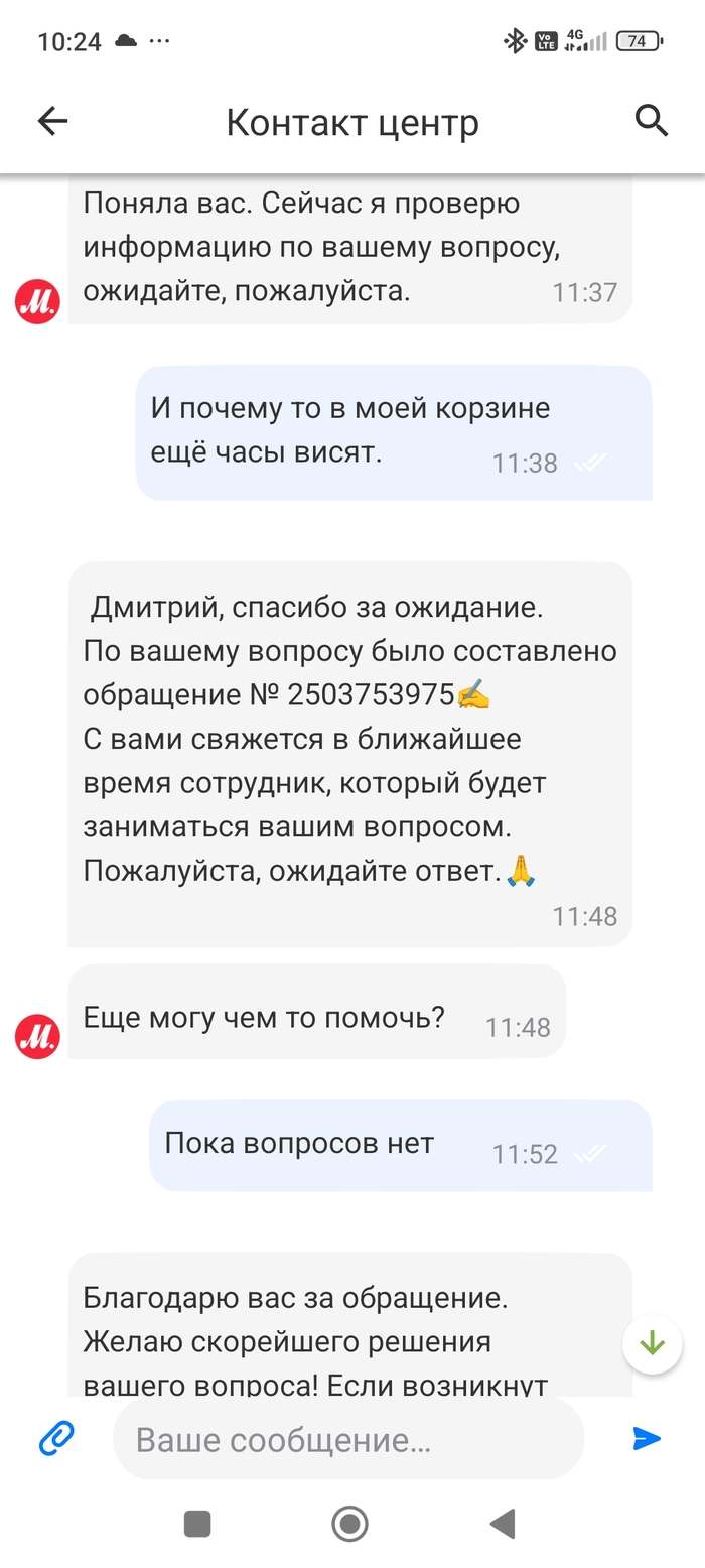 Вот и весь диалог. Дальше в течение дня звонка так и не поступило . Вечером решил ещё раз связаться с поддержкой.