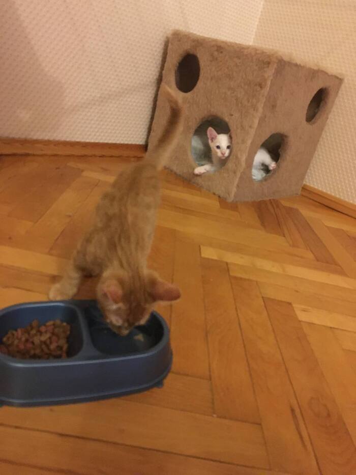 Персик постоянно терялся на фоне паркета, а Пломбир постоянно торчал в самых труднодоступных местах.Его милая мордочка почти всегда была чёрная, и это тот редкий момент, когда он Пломбир, а не Грязный Снежок)