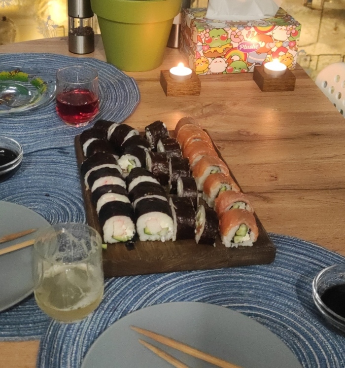 На всё про всё ну максимум полчаса времени. Получается вкуснее чем в кафе, особенно учитывая то, что последнее время все стали дико экономить на ингредиентах, но взвинтили ценники. Если красная рыба, то тооооненький кусочек, прозрачный, который вообще не чувствуется. Стал делать сам, после того как окончательно разочаровался даже в Нияме, где самая обычная Филадельфия из 6 кусочков сейчас, на минуточку, стоит уже 839р, и это в доставке. У меня весь ужин на 3х человек выходит дешевле.