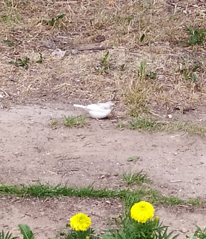 По пути мы встретили белого воробья. За качество извините, фотографировал даже не на тапок, а на шлепанец. А ведь это первый белый воробей в моей жизни. Никогда раньше не видел.