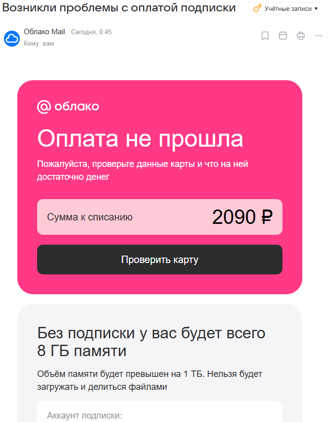 Подключал помню подписку в облаке мэил. Пришло письмо, типа оплати: