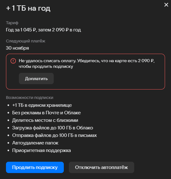 Меня сума заинтересовала, не помню чтобы за 2к подключал, большой объем не особо нужен. На моей памяти подключал 1тб заметно дешевле. Хаха, пока пишу пост, проверил банк. Смотрите что творят, оплата в 2024, и списания в 2025: