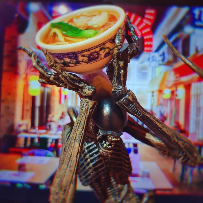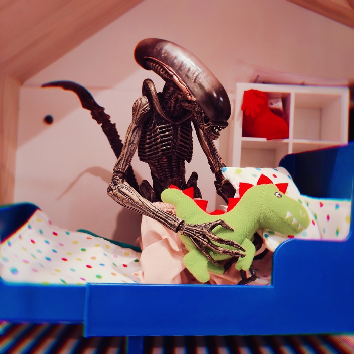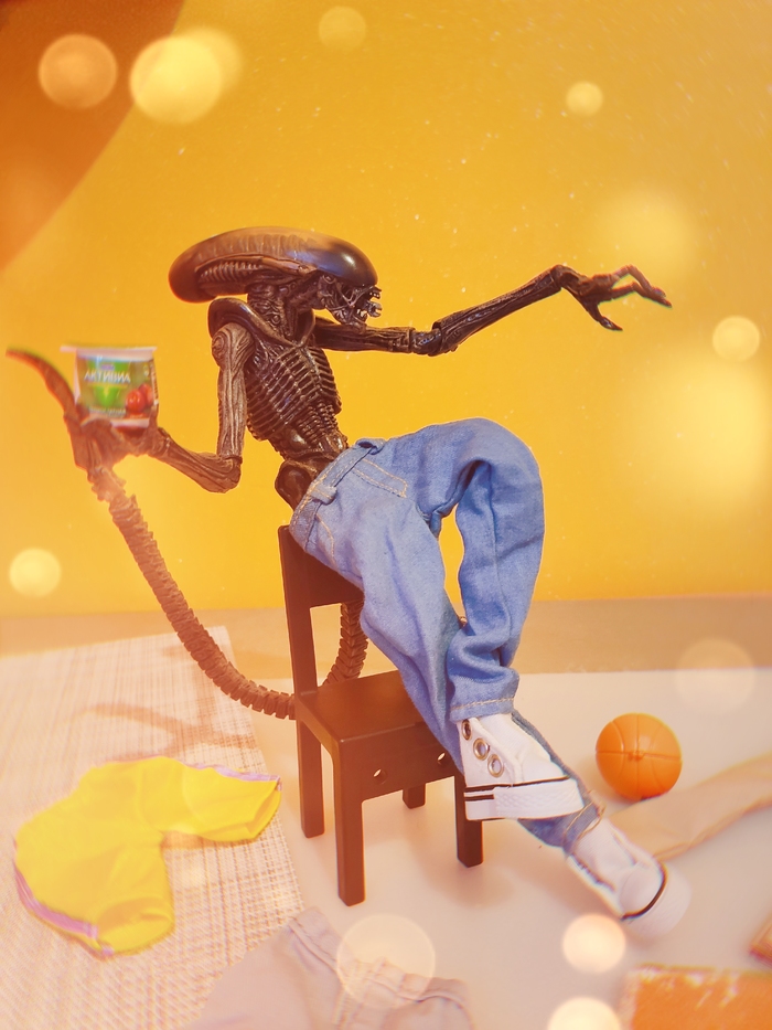 У меня уже пару лет есть шарнирная фигурка Чужого с хорошей детализацией, но она просто стояла в углу и радовала глаз, собирая пыль. А ещё у меня есть коллега, которая коллекционирует кукол. И однажды она принесла посылку с кукольной одеждой на работу. Я решила померить на Чужого штаны и кеды и так родился проект #aliendayoff - что делает Чужой в свободное от пожирания людей время. Веду потихоньку Инстаграм. И показываю вам, хочу возродить пятничное мое)