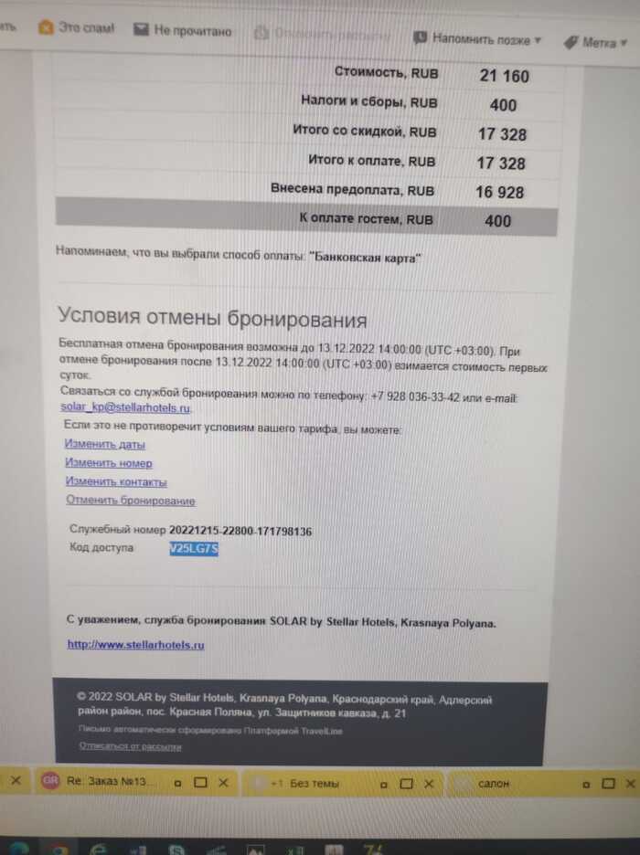 Решили на эти выходные выбраться на Красную поляну с женой, ребёнком и родителями с обоих сторон для празднования дня рождения жены. Мой отец приболел и как результат мои родители не летят. Билеты на самолет невозвратные тут всё понятно и без вариантов. А вот отель не смотря на то, что отмена бронирования предусмотрена отменять отказался. Причина - групповое бронирование, хотя это были три отдельных бронирования на разных людей но оплаченные с одной карты. Подскажите пожалуйста может кто скажет как действовать в данном случае? Скрин бронирования и ответ отеля прилагаю. Уточню все три бронирования оплачивались отдельно, но с одной карты.