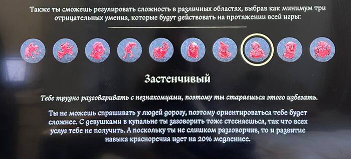 Теперь игроки не смогут видеть некоторые элементы интерфейса и свое отображение на карте, также отключено быстрое перемещение - поэтому дорогу придется спрашивать у местных. В дополнение нужно выбрать три негативных эффекта, которые будут действовать на Индро. Некоторые из них слишком реалистичны =D