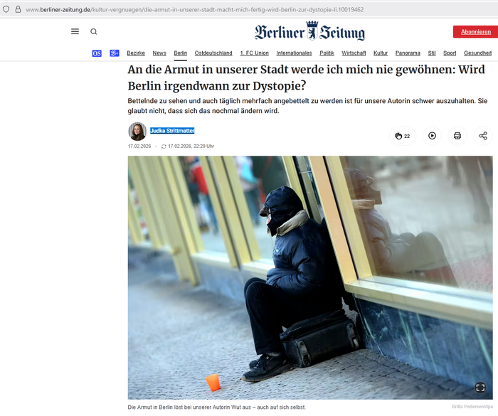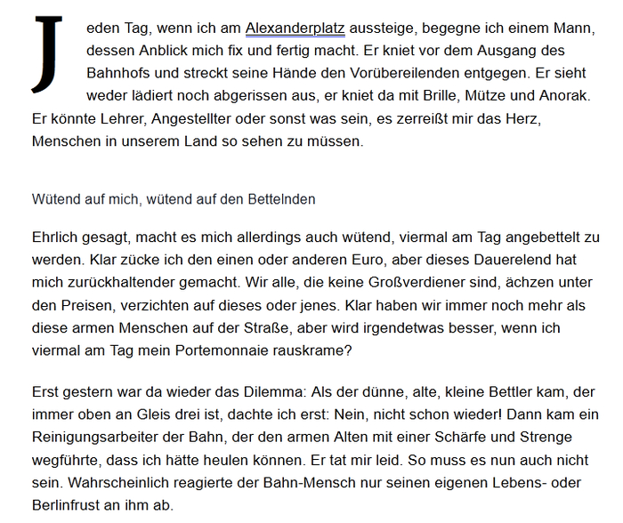 Честно говоря, меня также злит, что по четыре раза на дню просят милостыню. Конечно, я достаю тот или иной евро, но это непрекращающееся бедствие сделало меня сдержаннее. Мы все, кто не является высокооплачиваемым, страдаем от цен, отказываем себе в том или другом. Конечно, у нас все еще больше, чем у этих бедных людей на улице, но станет ли хоть что-то лучше, если я буду по четыре раза на день доставать свой кошелек?