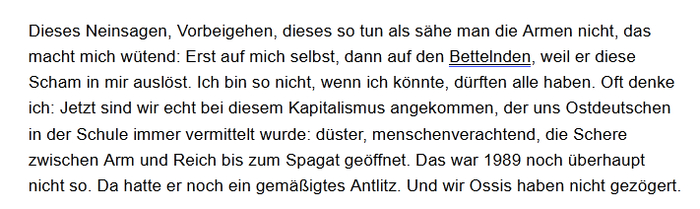 Это «нет», прохождение мимо, это притворство, будто не видишь бедных, приводит меня в ярость: сначала на себя, потом на нищего, потому что он вызывает во мне этот стыд. Я не такая, если бы я могла, у всех всё было бы. Я часто думаю: вот теперь мы действительно дожили до того капитализма, который нам, восточным немцам, всегда внушали в школе: мрачный, человеконенавистнический, пропасть между бедными и богатыми, разверстая до полного шпагата. В 1989 году всё было совсем не так. Тогда у него было еще умеренное лицо. А мы, восточные немцы, не колебались.