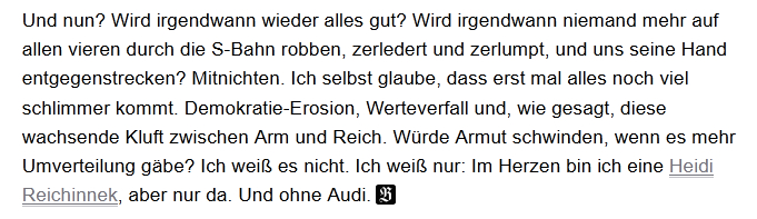 И что теперь? Станет ли когда-нибудь снова всё хорошо? Перестанет ли кто-нибудь когда-нибудь ползать на карачках по электричкам, оборванный и ободранный, и протягивать нам руку? Отнюдь. Я сама верю, что поначалу всё станет еще намного хуже. Эрозия демократии, упадок ценностей и, как уже сказано, этот растущий разрыв между бедными и богатыми. Исчезла бы бедность, если бы было больше перераспределения? Я не знаю. Я знаю только: в душе я Хайди Райхиннек, но только в душе. И без «ауди».