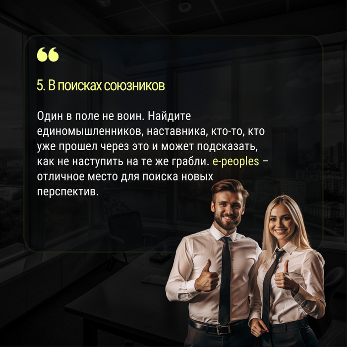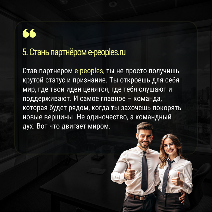 Не стесняйтесь обращаться за помощью. Возможно, вам потребуется консультация маркетингового специалиста или коуча по продажам. Также, став партнёром e-peoples, вы получите доступ к сообществу единомышленников и профессионалов, готовых поддержать и поделиться своим опытом.