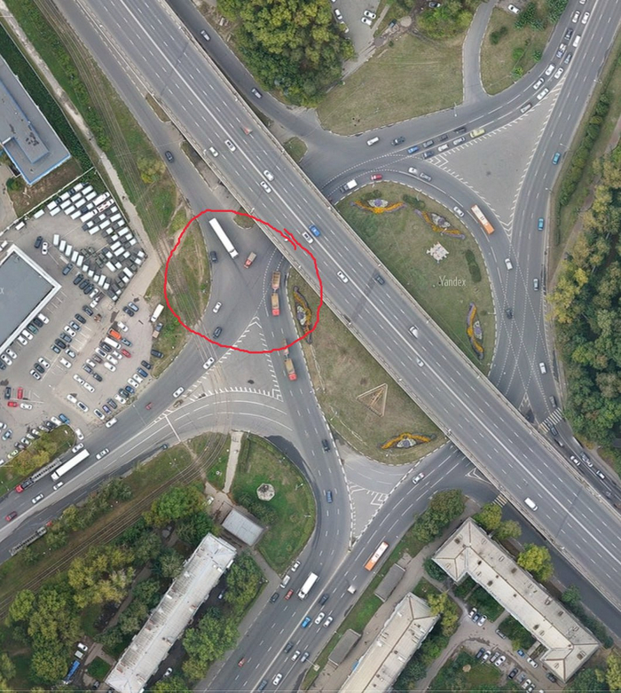 И вот тот самый треугольник в нижней части развязки - сделал её не участком с круговым движением, а (ВНЕЗАПНО блеать) - группой перекрестков! А вот в головах водителей он таки остался кругом... Достаточно часто в итоге водители, проезжая вот это вот место
