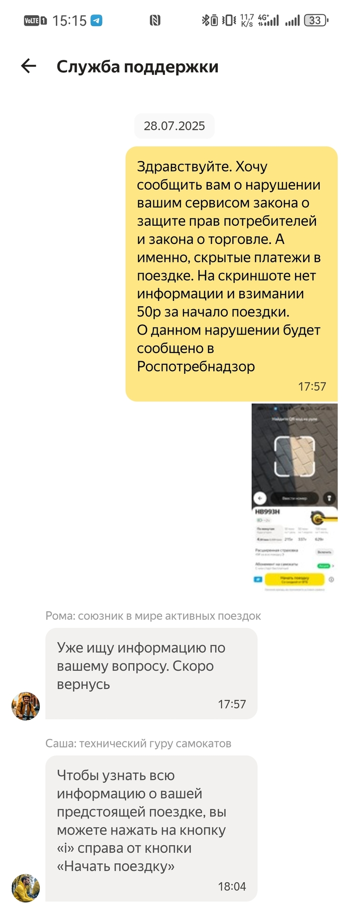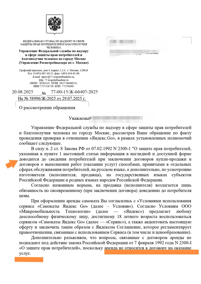 Для ЛЛ: при аренде самоката Яндекс не указал "стоимость старта" в явном виде, а спрятал её под кнопочку. Роспотребнадзор считает, что это нормально.