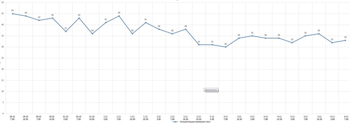 Сразу маленькие поправочки: первые 2 дня (то есть 29 и 30 числа) были контрольными. В это время я ещё придерживался обычного режима. Данные чистые, так как в это время не употреблялось кофе и не было других факторов, каким либо образом влияющих на показатели, кроме некоторых промежутков: 4.11 был пропущен обеденный 20 минутный сон, и в этот же день был плотный ужин за небольшое время до сна, но сильного влияния на показатели они не оказали.