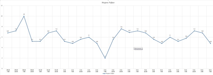 4) Индекс Руфье. Представляет собой тест, по результатам которого можно судить о работе сердца во время физической нагрузки. Состоит из 3 измерений: 1) Замер пульса в течение 15 секунд. 2) Выполнение 30 приседаний за 45 секунд и снова замер пульса. 3) Минута отдыха и ещё одно измерение пульса. Потом считаем индекс по формуле (4×(Р1+Р2+Р3)-200)/10, где Р1, Р2 и Р3 - 1, 2 и 3 измерения пульса.