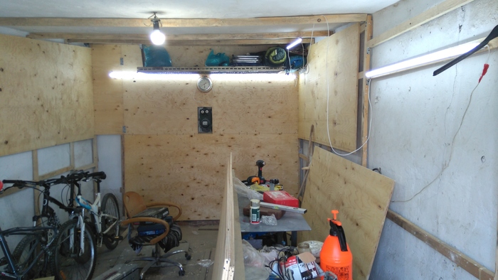 Первым делом сделал обрешетник по всему внутреннему периметру гаража, на который я и крепил листы фанеры (фото 3).